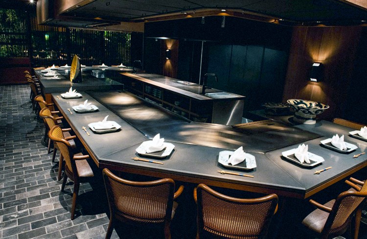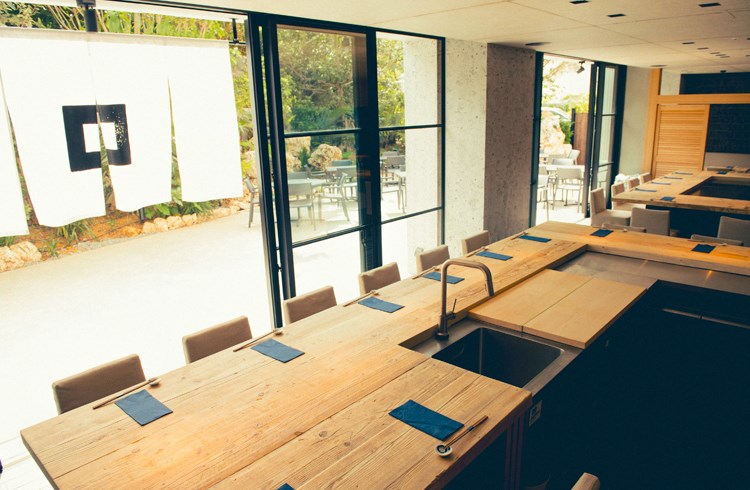職人が目の前で仕上げるライブ感あふれるカウンター席。屋外のテラス席では、琉球石灰岩から流れる滝の音を感じながらゆったりとお過ごしいただけます。泡盛はもちろん、全国から厳選した日本酒や焼酎も取り揃えていますのでお料理と合わせてお召しあがりください。