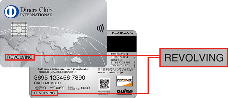 | カードデザイン | ![]() ダイナースクラブ リボルビングカードは、カードのおもて面/裏面に「REVOLVING」と印字されています。