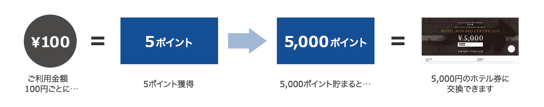 国内グループホテルのご宿泊、指定レストラン・バーのご利用金額をポイントに換算し(100円につき5ポイント)、専用のホテル券(5,000ポイントで5,000円分)と交換します。