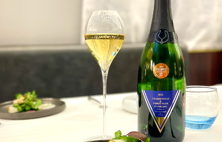 ロイヤルブルーにプラチナの文字が上品に輝くラベル「Chardonnay&Pinot Noir Sparkling 2021 Edition D」はダイナースクラブ会員様限定のオリジナルエディション。