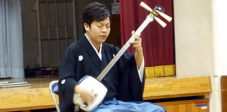 全校児童680名を対象に、津軽三味線の鑑賞コーナーでは計3曲を披露。ワークショップのコーナーでは、邦楽クラブの児童14名を対象に基本奏法の指導。最後の「ソーラン節」は、全校児童も手拍子と合いの手で参加。音楽の先生の歌声、邦楽クラブ児童の三味線との大共演となった。