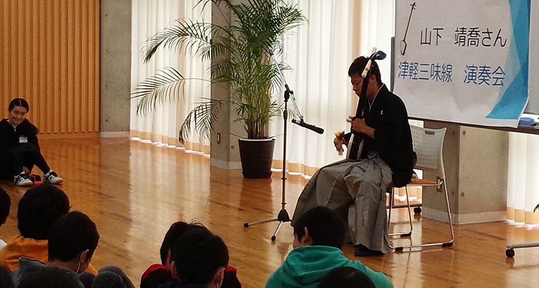 アーティストの訪問も少なくはなく、ある意味、外部からの講師等に 慣れている子どもたちである。その子どもたちも、さすがに津軽三味線日本一の山下靖喬君の演奏が始まると、それまでのわいわい感が消え、聴き入っていた。