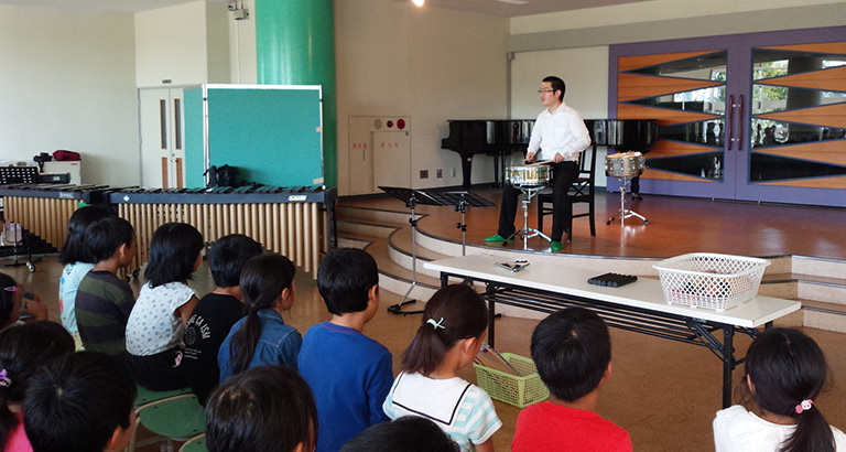 打楽器専攻の学生3名が、演奏を聴かせるとともに楽器体験を通して基本的な奏法の指導を行った。