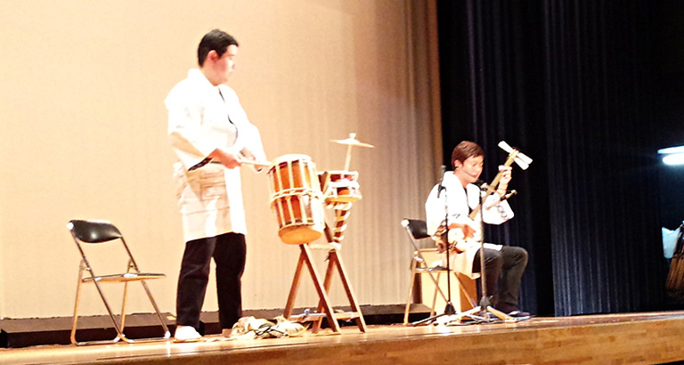 予定の50名をはるかに上回り、90名以上 の聴衆が集まった。スピード感あふれる超絶技巧の演奏と独創的なパフォーマンスによって、従来の日本音楽の枠を超えた二人の「芸」は、日本音楽を 聴き慣れた地域の方々にも新鮮な驚きと感動をもたらした。