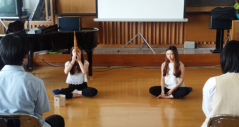 東京藝大邦楽科で雅楽を専攻する学生が高校生の前で、笙(しょう)や篳篥(ひちりき)といった楽器を演奏しました。