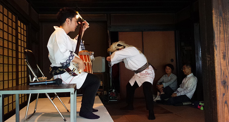 山下君の三味線の迫力に子どもは圧倒され、さらには石森君の面を付けて衣装をまとった舞と演奏に大きな歓声を送っていた。