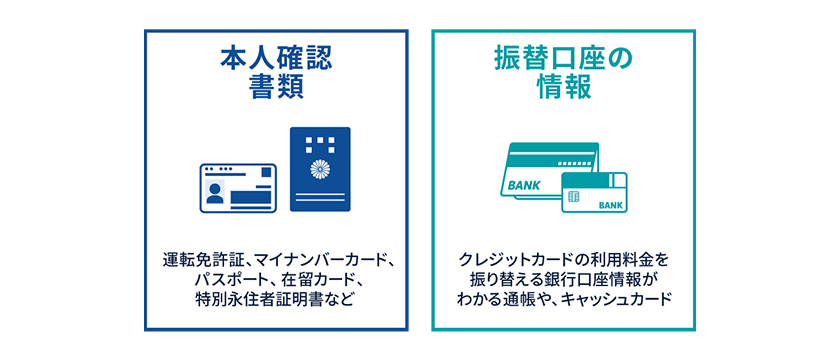 クレジットカードの利用料金を振り替える銀行口座情報がわかる通帳や、キャッシュカードを用意します。