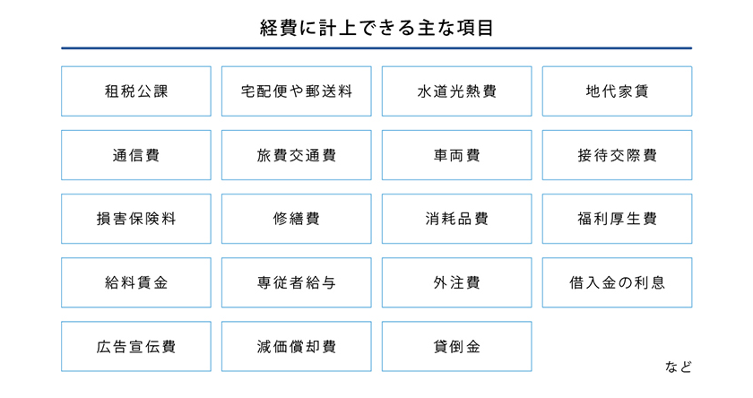 個人事業主が経費として計上できるのは、「事業を行うためにかかった費用」であると証明できるもののみです。具体的には、次のようなものがあります。