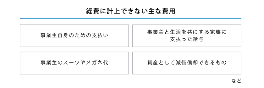 事業主自身に支払う給与や事業主の健康診断費のほか、プライベートな食事代や買い物代は経費になりません。従業員がいない場合の福利厚生費、所得税、住民税、国民健康保険の保険料、国民年金の保険料などは「事業主個人の支出」と見なされ、経費には計上できません。