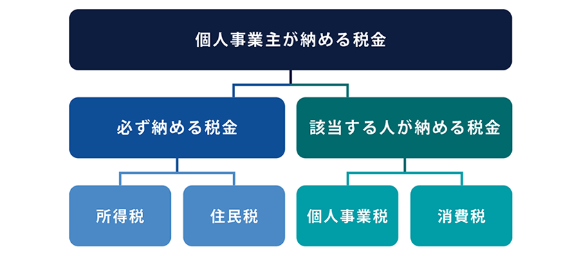個人事業主が納める主な税金は、所得税、住民税、個人事業税、消費税の4種類です。所得税と住民税は必ず納める必要がある税金で、個人事業税と消費税は、条件に該当する場合のみ納める税金です。