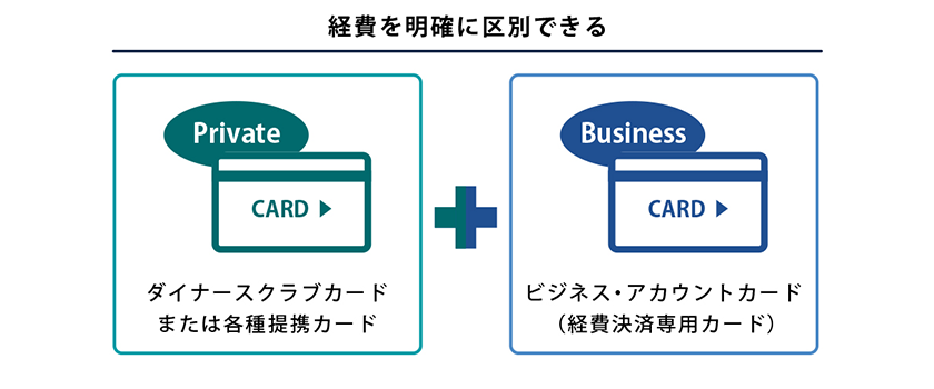 ダイナースクラブ ビジネス・アカウントカードと、本会員カードとなるダイナースクラブカードで、別々の支払口座の設定が可能。法人口座の設定もでき、利用代金明細書も別になるため、プライベート用と経費用に分けた経費の管理が容易になります。