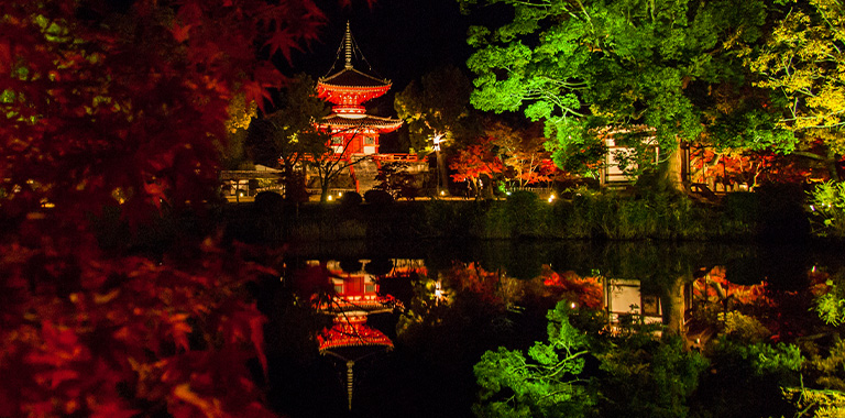また、夜間には周囲約1kmの日本最古の人工の林泉(林や泉水などのある庭園)、大沢池を貸切でゆったりとお楽しみいただけます。僧侶の法話とともに、ライトアップされた幻想的な空間をご体験ください。