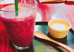 おやつタイムの会場、「くらかふぇ糀's」ではすべてのメニューに砂糖を一切使わず、米糀を甘味料としています。今回は、ブルーベリースムージーとクリームブリュレをお召しあがりいただき、田植えで疲れた体を優しい甘みで癒していただきました。