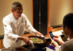 お席はカウンターのみ。素材にこだわったお料理を提供します。来店された皆様にまず、「外観、内観のお写真は控えていただきたい」のお願いを済ますと、さっそくお料理を楽しんでいただく準備。初めての会食会、ご主人も、皆様も少し緊張気味です。