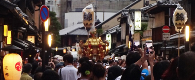 「桃庭」の2階から神輿を担ぐ町の人の熱気と、目の前に通るお神輿をご覧いただきました。夏の暑さとは別の心地よい熱気に京都の夏を感じていただけました。