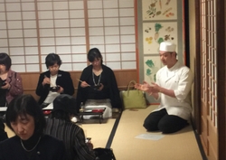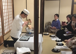 先代の高橋英一氏が鰹の渋みや酸味に疑問を持ったことから、「瓢亭」では「鮪節」に到達し「一番出汁」「二番出汁」「八方出汁」の3つを使い分けています。この秘伝ともいわれる出汁の実演をお食事前にご覧いただきました。