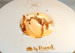 デザートは、イタリア・ヴェローナで“世界一のティラミス”と称された、アルポンピエーレ特製ティラミス。この日は白トリュフと合わせた真っ白な一品。