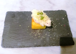 5皿とデザート、お土産まで南イタリアの素材をふんだんに使い、一皿一皿が生産者の素材への思いを語り、宮嶋氏が軽快なトークと通訳で皆様に伝えます。目玉でもあったブロンテ産のピスタチオは2年に1度の収穫となり、バッカラマンテカート(干し鱈の料理)にふんだんに使いました。