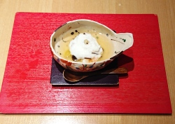 まずは、笠原氏からのご挨拶。皆様最初は緊張の面持ちでしたが、料理が始まるとお客様同士のお話がはずみリラックスした雰囲気に。「金目鯛と天使の海老のかぶら蒸し」は御出汁がきいて皆様を優しい笑顔に。
