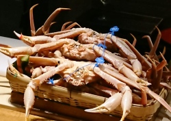 冬の食材として「蟹」をメインとしたお食事はもちろんですが、やはり店主の佐々木浩氏のお話が皆様を楽しませます。1,000匹のうち20匹程度しか獲れない献上ガニ。目の前にある大きな蟹は7回脱皮をしたもので、なぜ蟹が高価になっているのかというお話などを伺いながら焼き物、たき物、最後には蟹チャーハンを堪能。