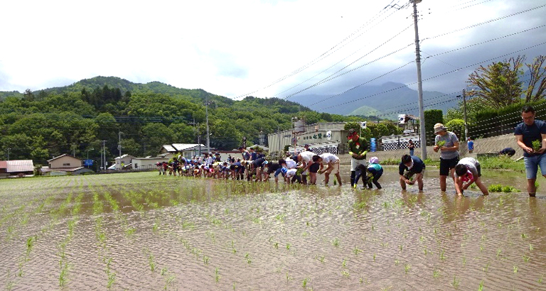 中腰の作業が続き、疲労も溜まった頃、そんな時に嬉しいのが糀の甘味が特徴的な山梨銘醸(株)の甘酒。冷やして飲むととっても美味しい。ぐびぐびと飲み干し、また稲を植えに戻ります。あっという間に1時間が過ぎ、田植えが終了です。