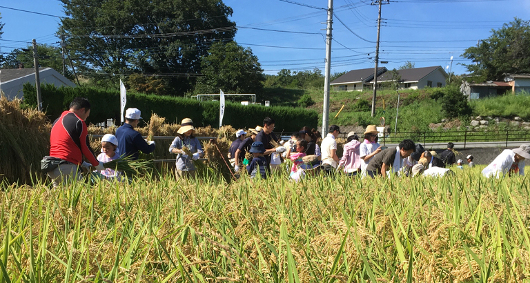 5月に植えた稲が、すっかり収穫どきに。大きな台風を乗り越え、立派に育った稲が目に映り、感動もひとしおです。参加者の皆様は怪我をしないよう、束にした稲をカマで力いっぱい刈っていきます。お子さまたちも、器用にカマを扱い、稲刈りを楽しんでいました。