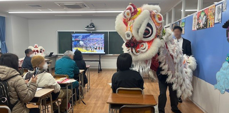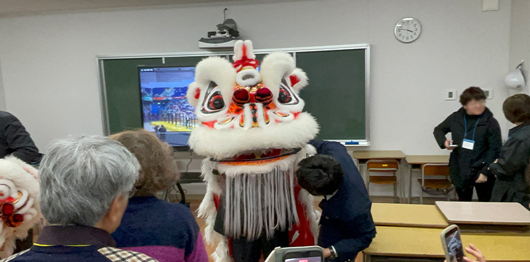 横濱中華學院で獅子舞を被る体験をする参加者