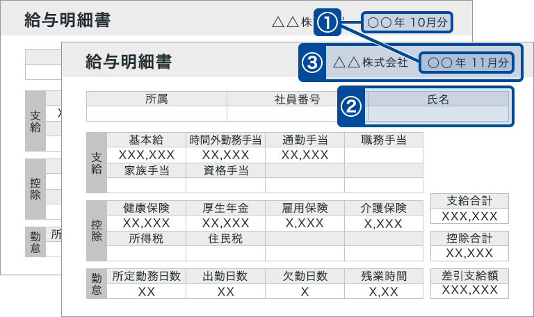 ③企業名、給与支払者、受給者名、支払年月日の記載があるもの