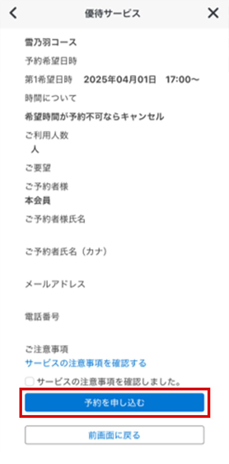 日時や利用人数などを入力し、入力内容を確認のうえ、「予約を申し込む」をタップ。