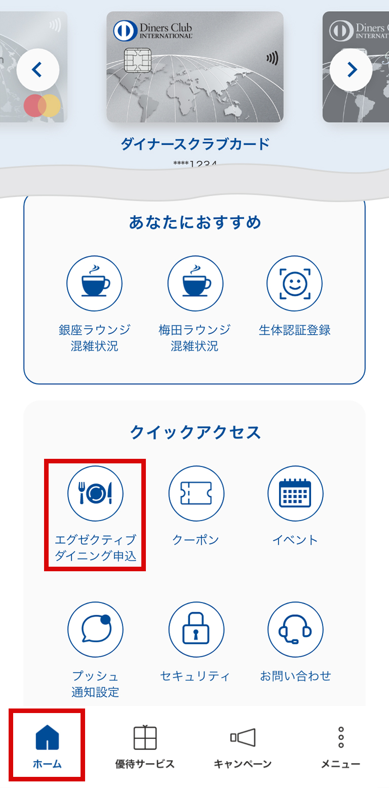 「ホーム」>「エグゼクティブ ダイニング申込」のアイコンをタップ。