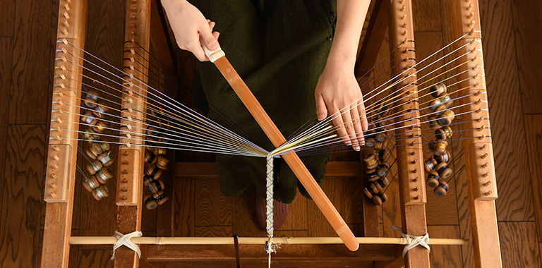 上野池之端に店をかまえる組紐処『道明』。1652年の創業以来さまざまな組紐の製作を行ってきました。製品はすべて自社の職人による手染め、手組み。今回は、歴史と技術面のお話を伺いながら、道具や古い復元品、実際の紐を組む様子まで、余すところなく見学していただきます。