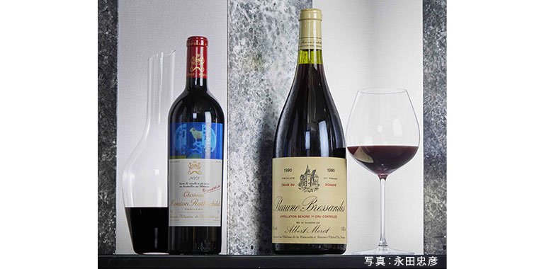 左から:王者の風格漂うボルドー・メドックで最も芳醇で味わい豊かなワイン「シャトー・ムートン・ロートシルト 2008年」。/ボーヌの1級畑を7つ所有する造り手による、希少な古酒のマグナムボトル「アルベール・モロ ボーヌ1級 ブレッサンド 1990年」。
