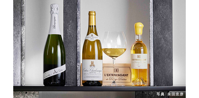 左から:松本章氏が手がけ、750本のみリリースされた「キュヴェ・アキラ 特級NV」。/ブルゴーニュの中でもひときわ希少なグラン・クリュ「レオンス・ボッケ コルトン・シャルルマーニュ特級 2018年」。/“ソムリエのデザート”として知られる希少な貴腐ワイン「ドワジー・デーヌ レクストラヴァガン 2019年」(ハーフボトル)。