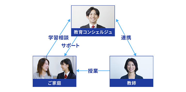 教育コンシェルジュは、「成績が上がらない」「やる気が出ない」といった学習上の課題への対応にとどまらず、教師とご家庭をつなぐ役割としても機能します。