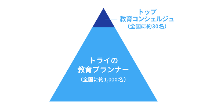 トライには、教師のほかに教育のプロである"教育プランナー"がお子様一人ひとりに付いてサポートするという独自のサービスがあります。なかでも、全国でも限られた教育プランナーが認定される『トップ教育コンシェルジュ』は、受験戦略の立案から学習カリキュラムの作成、ご家庭と教師との橋渡しまで、学びに関わるすべてをコーディネート。