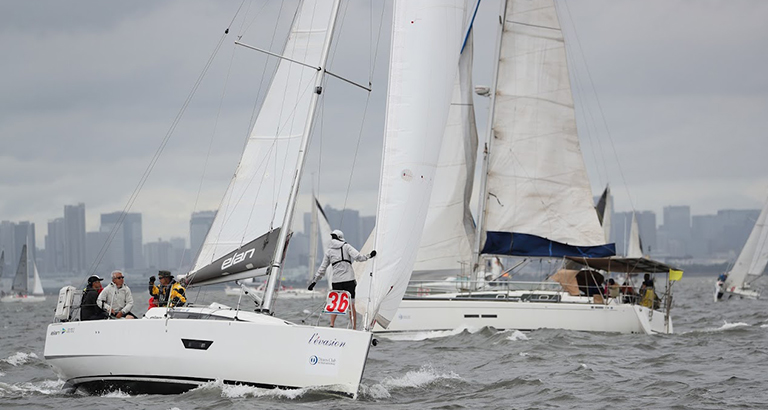 最大で風速17~18ktの風が吹き、海面には白波も。ハードなレース展開になると思いきや、途中で風が落ち、ピタっと止まるような事態も。さらには、急なスコールがあり、セーラーの皆様はずぶ濡れに。