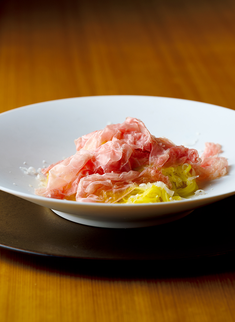 時間と手間のかかるこの自家製パスタだが、本場では白トリュフと合わせることが多い。でも季節が限られるということで、平山さんは考え抜いた末にパルマハムを合わせ、食べている途中でレモンをちょっと搾り、味の変化を楽しむことがベストだということにたどり着いた。極細麺だがしっかりとしていて、チーズやハムに負けない強さがある。