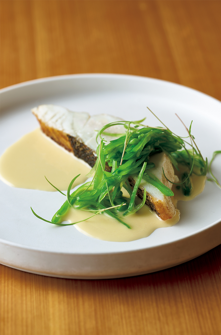 ところでこの店には料理名がない。素材がそのまま料理名となるのである。だから次の一皿は、前田さんから仕入れたスズキのローストとなる。白ワイン、バター、魚のアラからとったソースはさりげなくスズキを引き立てる。