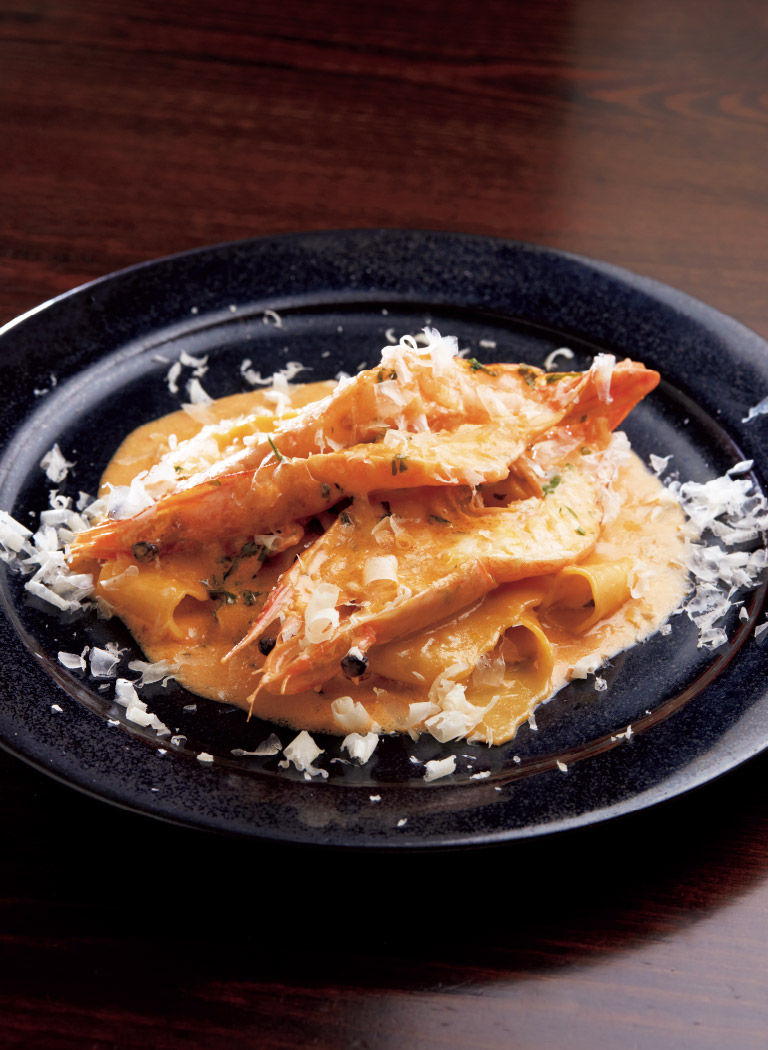 シーズナルで新鮮な食材名が並ぶメニューから「今月の一皿」に選んだのは、「天使エビ トマトクリームソース パッパルデッレ」。実は常連の方にも楽しんでいただけるようにと、定番よりもその日のメニューが多く、スペシャリテは特に決めていなかったのだが、このパスタのレシピは修業先の師匠から譲り受けた髙橋シェフの原点だからと、定番の中心に加えたそうだ。