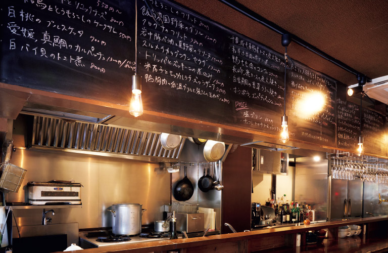 頭上にある黒板のメニューを眺めて、カルパッチョや生ハムを軽くつまんでもよし、ボリューミーなカツレツと一緒に豊富なグラスワインを飲み比べてもよし。毎週通いたくなるお店だ。