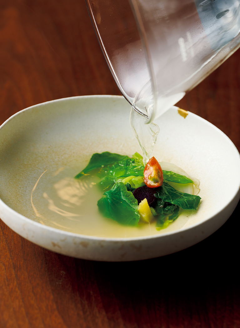 西麻布という東京の真ん中で、中東さんが摘み取った四季の野菜を取り入れた料理はどれも身体に優しい。料理人一家である中東家のDNAを感じながら、大地に恩返しをしているような体験だ。