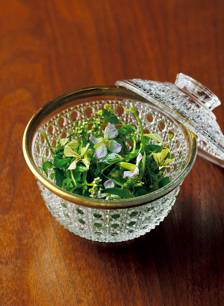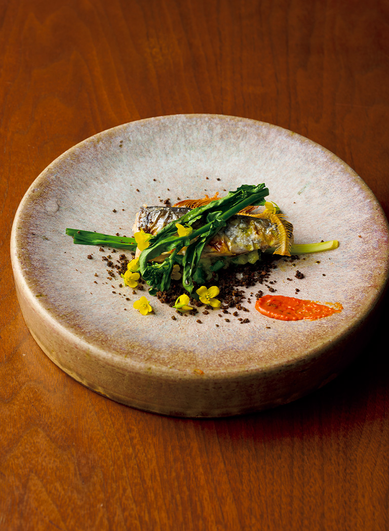 3月が解禁のヤマメ。寒い冬を越えた身はとても旨みがあり、しっとりとしていて味が濃く、川魚独特の風味が素晴らしい。土に見立てたブラックオリーブ、香ばしい骨や“のらぼう菜”のほろ苦さが良いアクセントになっている。食材を余らせることなく皿の上に並べていく飾り付けも芸術的だ。