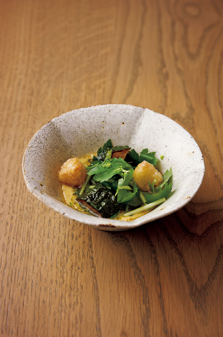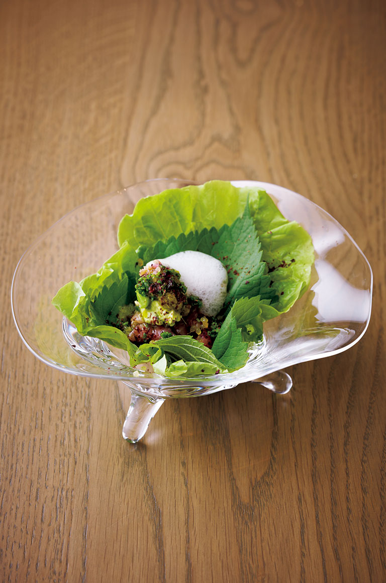 メニューには食材名しか書かれていないので、料理が進むごとに産直の厳選素材がどう料理されるのか楽しみは尽きない。「マグロ、サンチュ、行者ニンニク」は、カルパッチョなのだが韓国料理のようにサンチュで包んで食べる一皿。手づかみでがぶりといただくと、サンチュに包まれたマグロにオリジナルオイルの酸味が混じりあって心地よい。