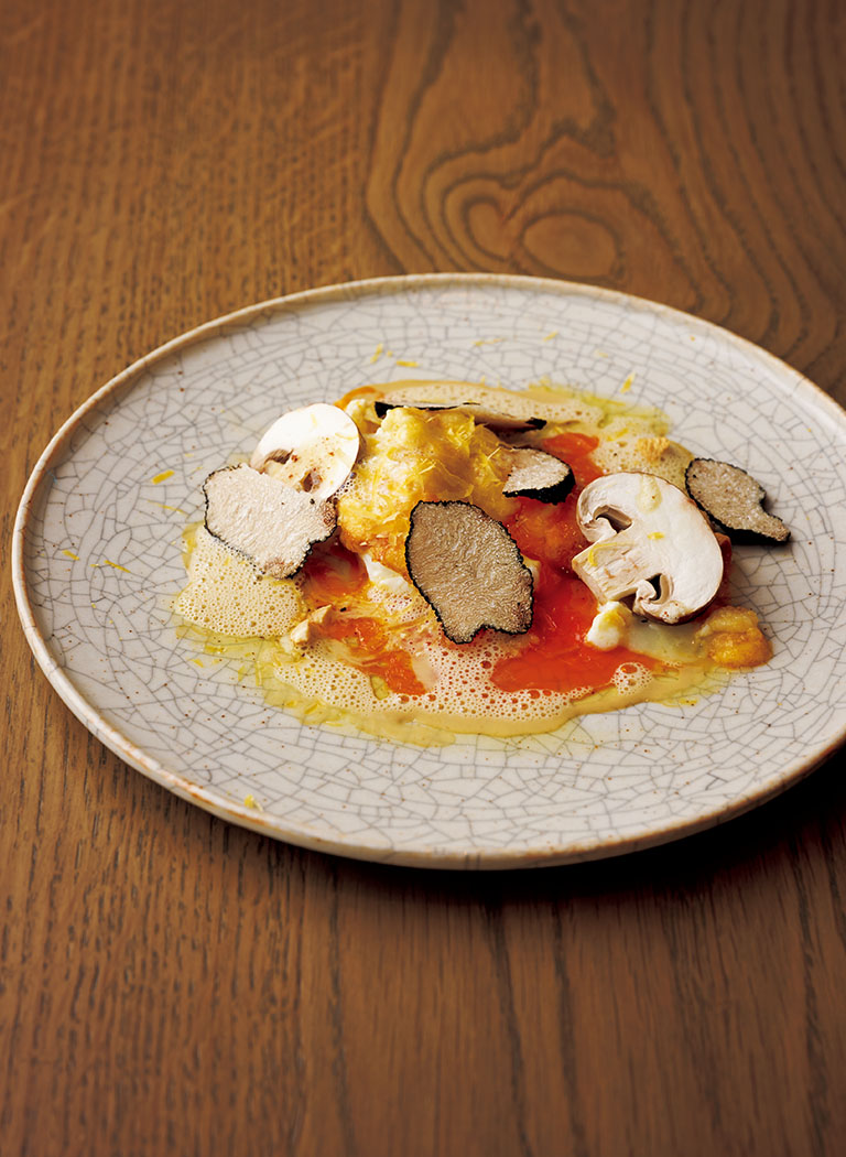 「トリュフ、フォアグラ、甘夏」と題されたトリュフを使ったクレープが、「今月の一皿」だ。甘夏、白カビチーズ、サマートリュフ、ブラウンマッシュルームなどなど、この一皿で使われている食材を書けばキリがない。