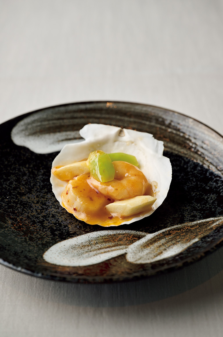 夜のコースメニューでは、色とりどりの美しい料理が和食器に盛り付けられる。この日は「海老、帆立、チシャトウのピリ辛炒め」が秀逸だった。また、フカヒレの白湯スープも、ぜひ一度は味わってほしい。