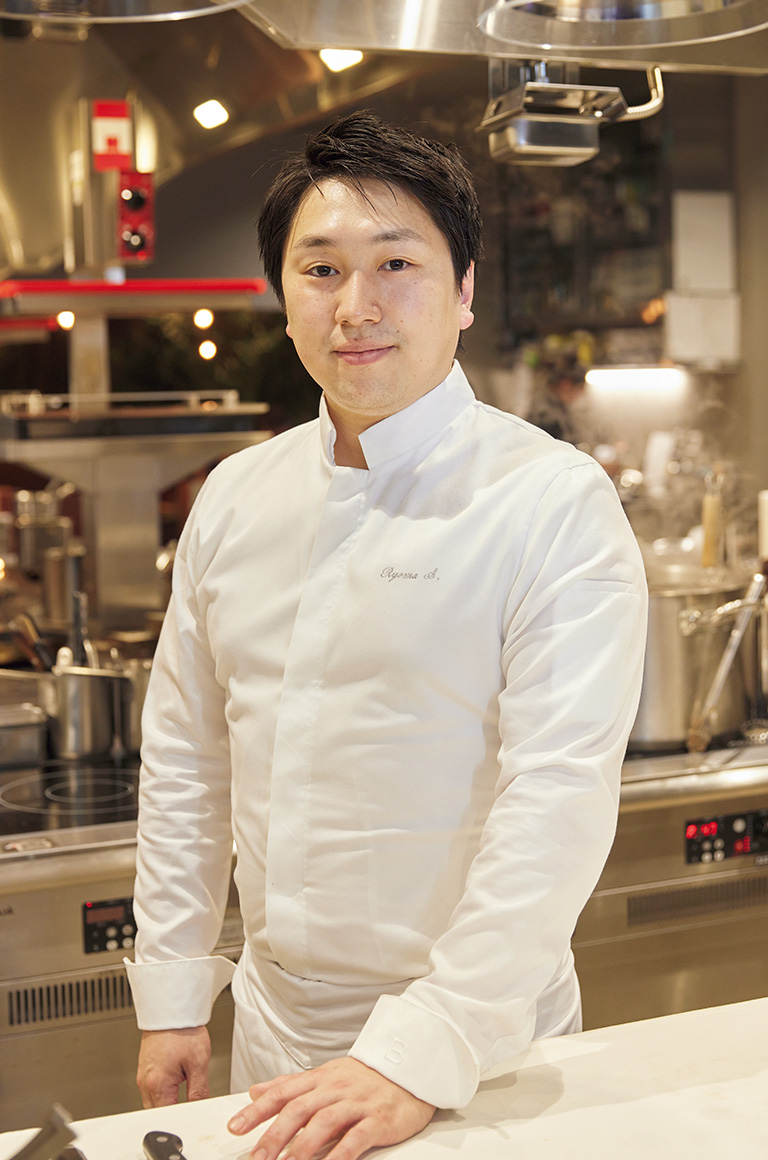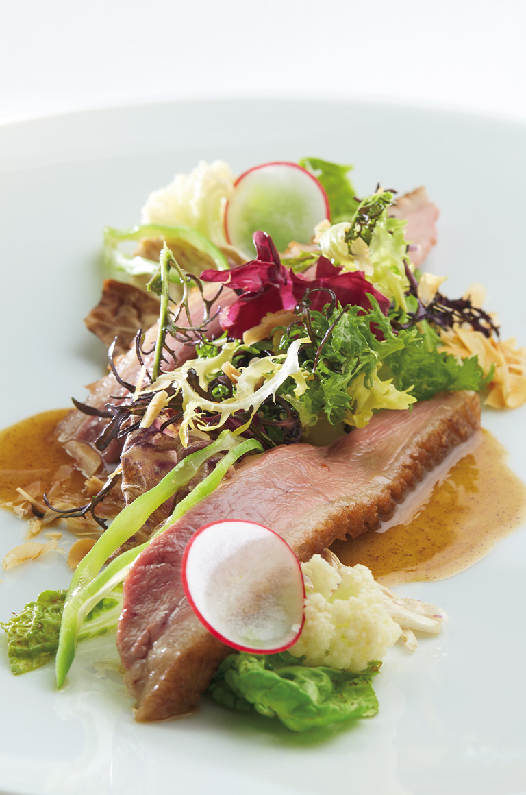 淡い色が美しいとてもシンプルな料理だ。「日本がルーツなので国産の食材を多く使い、つねに変化を大切にしています」と、信太シェフ。石川県の能登の野菜や、京都府亀岡の鴨など、信頼できる生産者から直接仕入れることが多いそうだ。