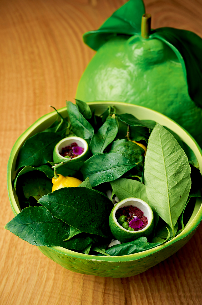 エンターテインメントも、この店の大事なコンセプト。冷前菜では、テーブルに大きなレモン(器です)が運ばれてくる。その中には本物のレモンを器にしたビーツのタルタルが。丸ごとオーブンで2時間もローストしたというビーツは甘みが増して、ほくっとした食感に。