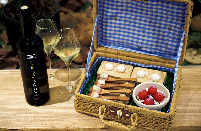 さて、もうご存じの方もいらっしゃるかもしれないが、こちらのもう一つの名物が“ピクニック”だ。2階のメインダイニングに向かう前、1階のグリーンハウスでバスケットに詰められたピンチョスをつまみ、バスク地方のワイン「チャコリ」で喉を潤すという趣向。いっそ東京にいることは忘れて、バスクの青い空を想像してみることをお勧めしたい。