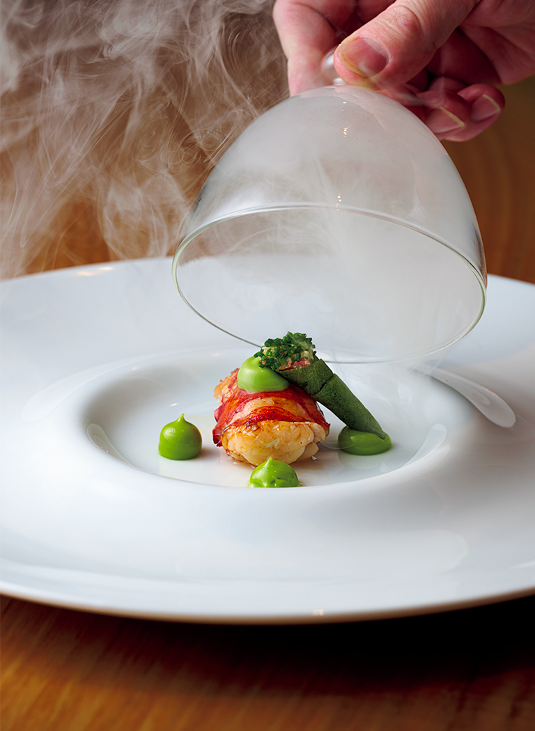 「今月の一皿」に選んだのは、温前菜の「オマール海老 青ネギ」。真っ白なお皿にガラス製のこんもりとした蓋がしてあり、その蓋を開けるとウィスキーオークのチップで燻製にした煙がフワッと立ち上がってくる。