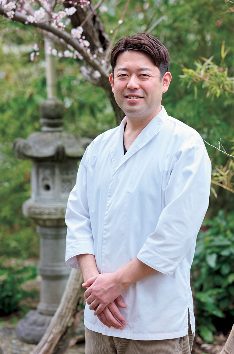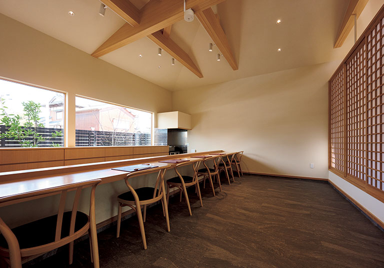 「祖父が大切にしていた庭を活かしたお店をつくりました」と『日本料理 福楽』オーナーシェフの媚山潤さん。趣のある灯篭を眺めながら小径を歩き、入口を通ると、大きな木のカウンターがバーンと迎えてくれる。ゆうに2階分の高さのある天井高やカウンター後ろのスペースなど、とても贅沢な空間が広がる。